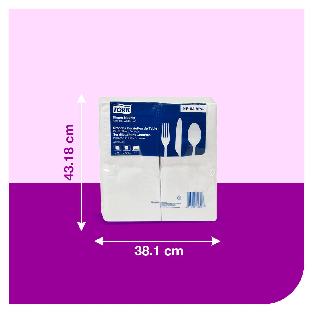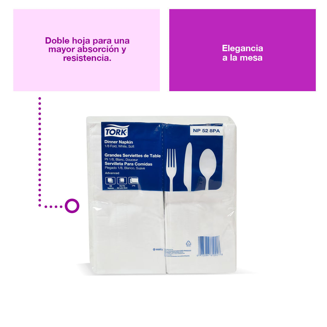 La Servilleta Dinner de Tork eleva la experiencia en mesa combinando elegancia, calidad y alto desempeño. Su acabado extra blanco, textura suave y gran capacidad de absorción la convierten en la opción ideal para negocios que buscan una presentación impecable en cada servicio. Gracias a su tamaño superior y doble hoja, es el reemplazo perfecto de las servilletas de tela en restaurantes, hoteles, banquetes y eventos especiales, optimizando costos sin sacrificar estilo. Su relieve decorativo aporta un toque sofisticado que realza la imagen de tu establecimiento, mientras garantiza higiene y eficiencia en cada uso.